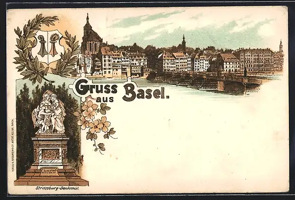 Lithographie Basel, Strassburg-Denkmal, Ortsansicht mit Rheinbrücke