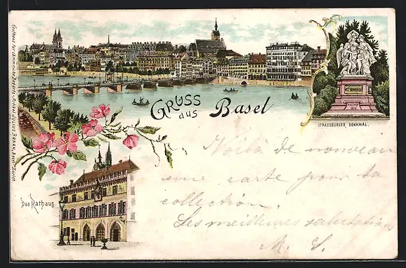 Lithographie Basel, Strassburger Denkmal, Rathaus, Panorama mit Brücke