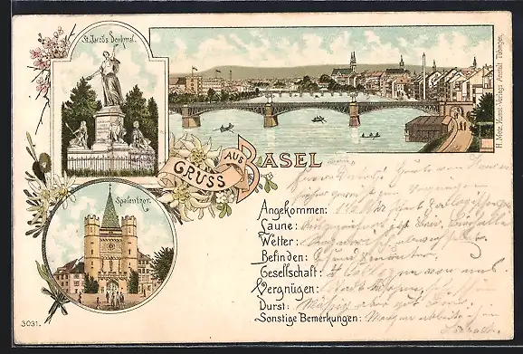 Lithographie Basel, Teilansicht, Spalentor, St. Jacobs-Denkmal