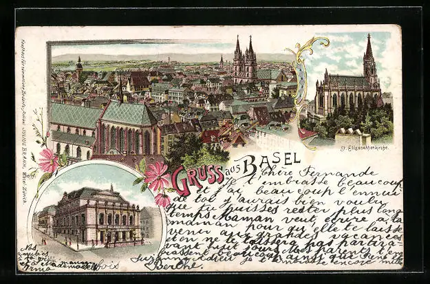 Lithographie Basel, Teilansicht, St. Elisabethenkirche, Theater