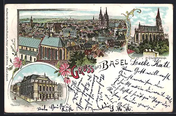Lithographie Basel, Teilansicht, St. Elisabethenkirche, Theater