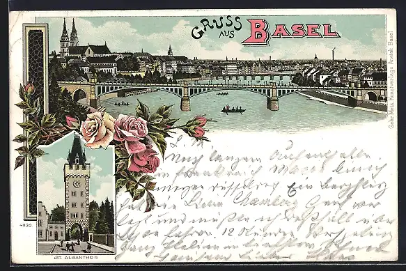 Lithographie Basel, Teilansicht mit Brücke, St. Albantor