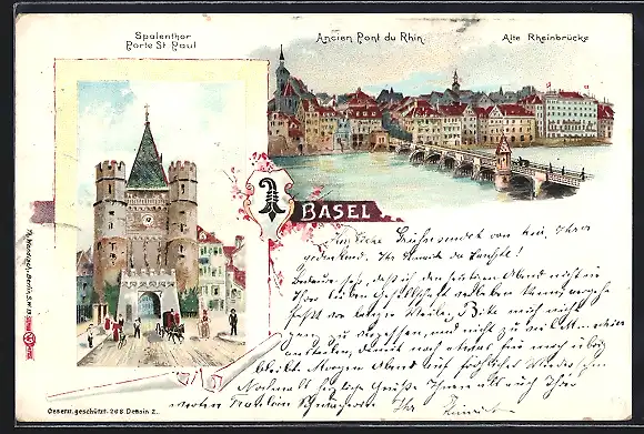 Lithographie Basel, alte Rheinbrücke, Spalenthor