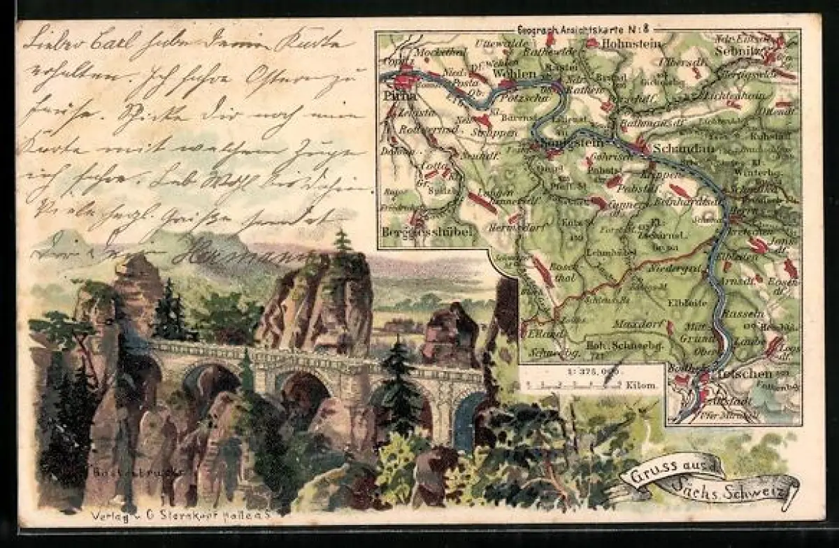 Lithographie Bastei, Panoramamit Basteibrücke, Landkarte der Sächsischen Schweiz