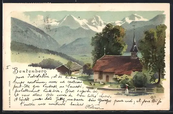 Lithographie Beatenberg, Partie an der Dorfkirche