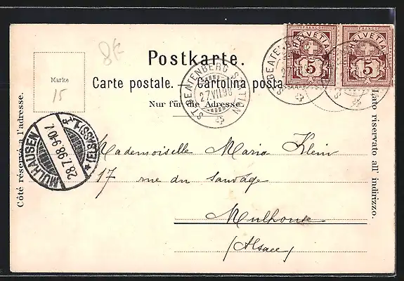 Personenbezogene Daten auf der Rückseite der Karte wurden durch blauen Textmarker unkenntlich gemacht. Die blauen Stellen sind auf die Vorderseite durchgeweicht und wirken sich negativ auf das Postkartenfoto aus