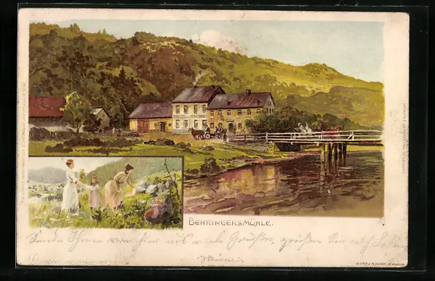 Lithographie Behringersmühle, Teilansicht, Frauen mit Kind auf einer Wiese
