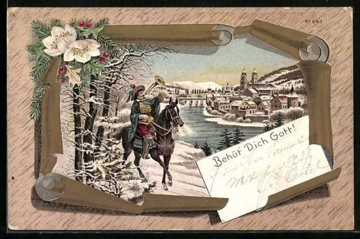 Lithographie Behüt Dich Gott!, Blumen, Der Trompeter von Säckingen zu Pferd