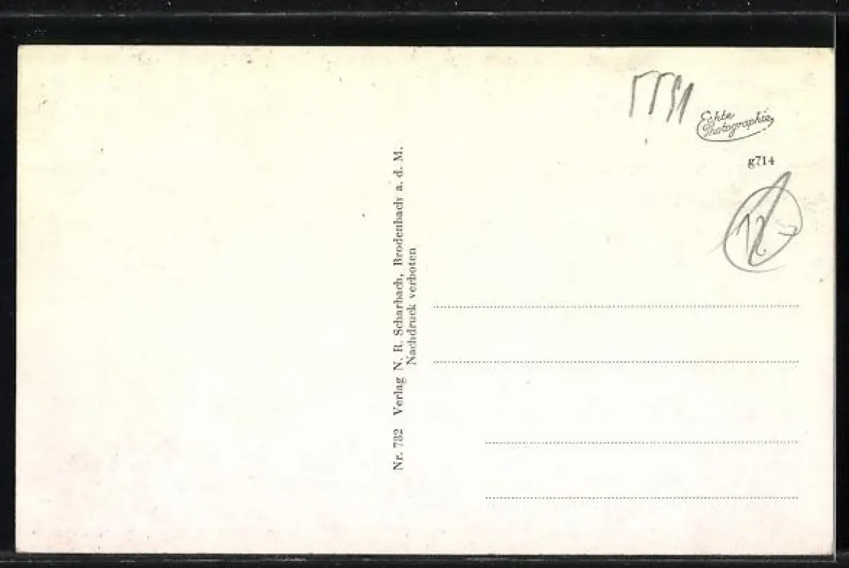 Personenbezogene Daten auf der Rückseite der Karte wurden durch blauen Textmarker unkenntlich gemacht. Die blauen Stellen sind auf die Vorderseite durchgeweicht und wirken sich negativ auf das Postkartenfoto aus