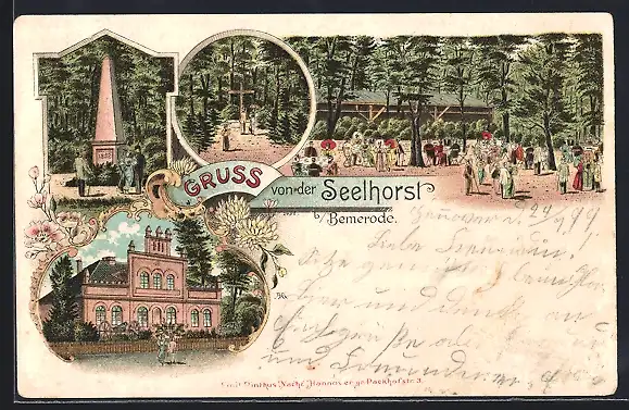 Lithographie Bemerode, Gasthaus Seelhorst, Denkmal, Kreuz