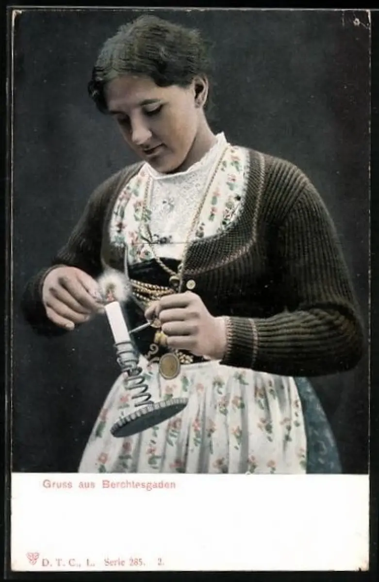 Lithographie Berchtesgaden, Frau in Tracht mit Strickjacke zündet Kerze an