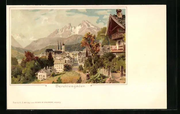 Lithographie Berchtesgaden, Ortspartie aus der Vogelschau