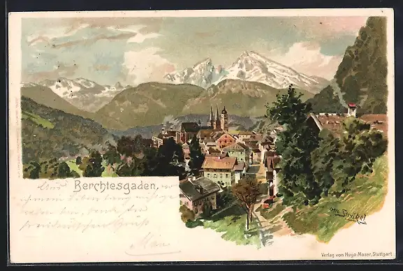 Lithographie Berchtesgaden, Teilansicht mit Kirche