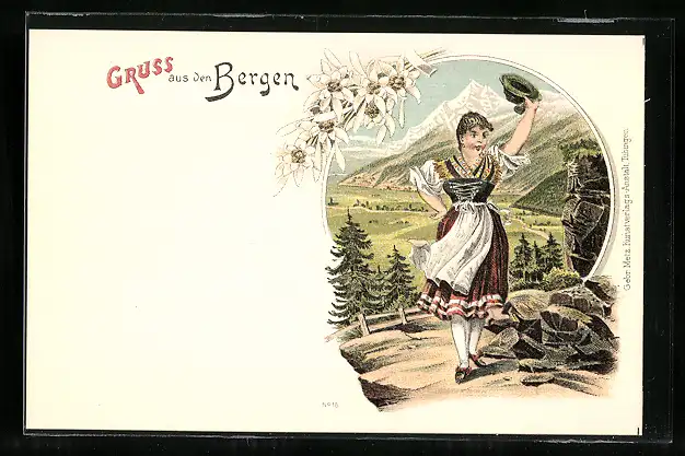 Lithographie Bergsteigen, Frau in Tracht winkt mit Hut