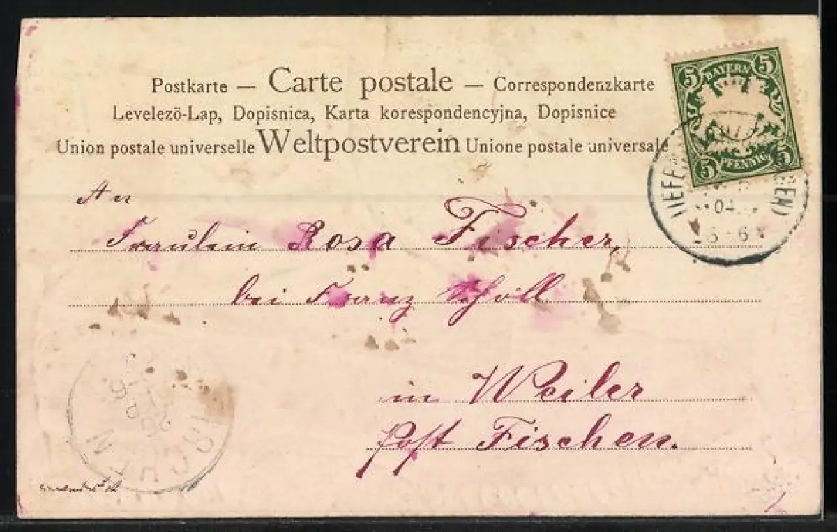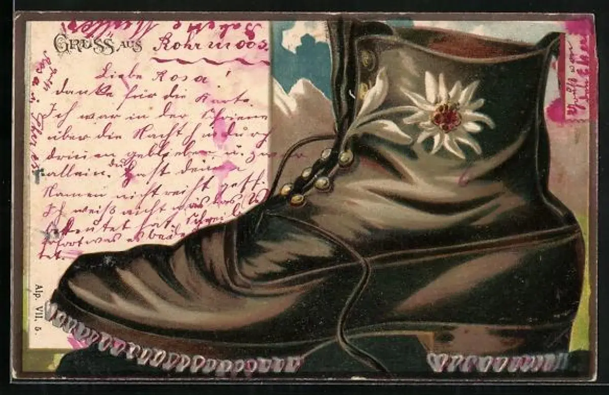 Lithographie Bergsteigerschuh mit Edelweiss-Applikation und Spikes um 1900
