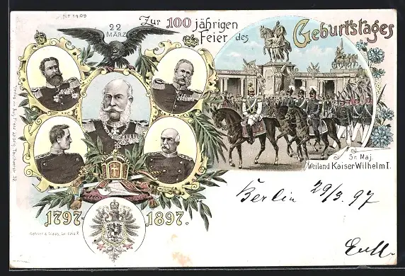 Lithographie Berlin, 100 jährige Feier des Geburtstages Sr. Maj. Weiland Kaiser Wilhelm I. 1797-1897, Nationaldenkmal