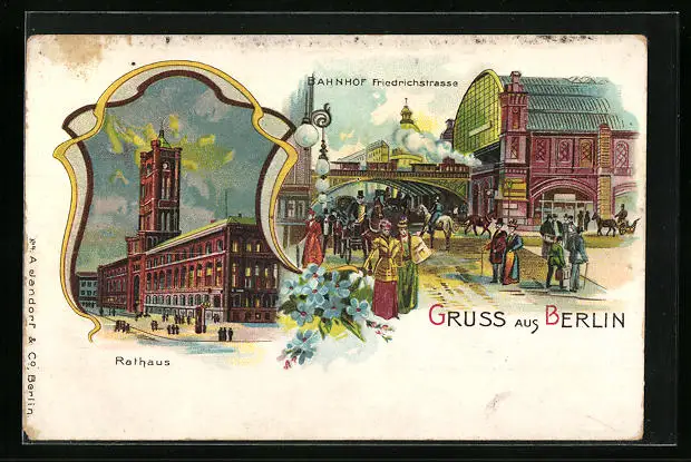 Lithographie Berlin, Bahnhof Friedrichstrasse, Rathaus