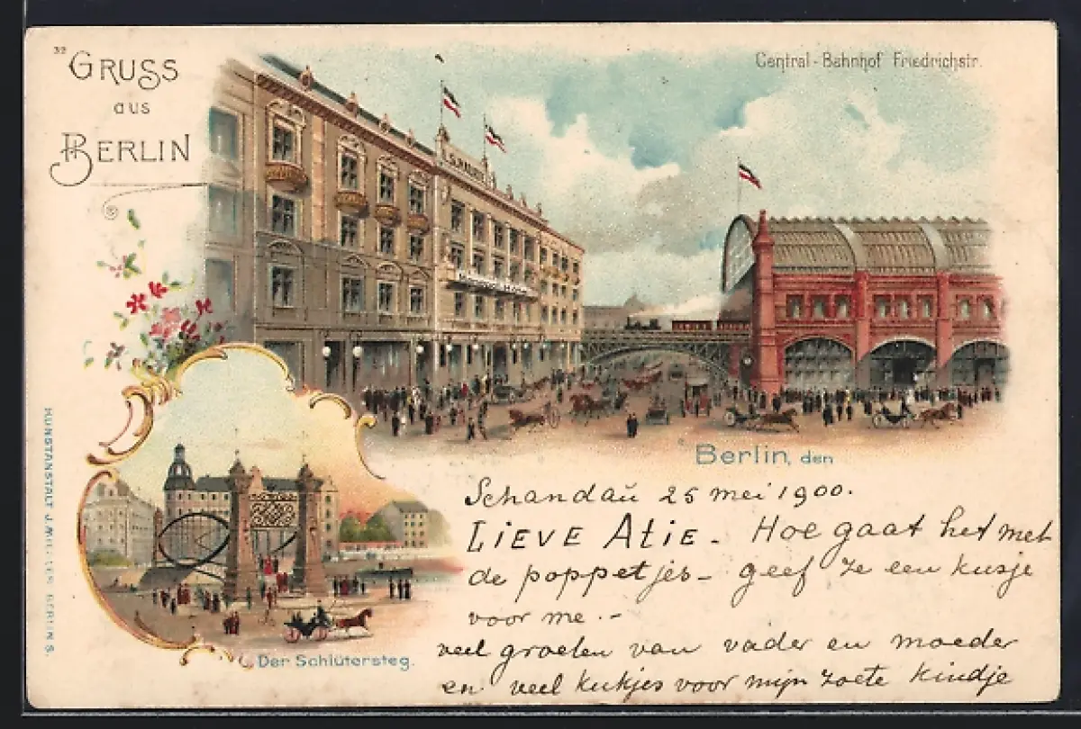 Lithographie Berlin, Bahnhof Friedrichstrasse mit Monopol-Hotel u. Schlütersteg