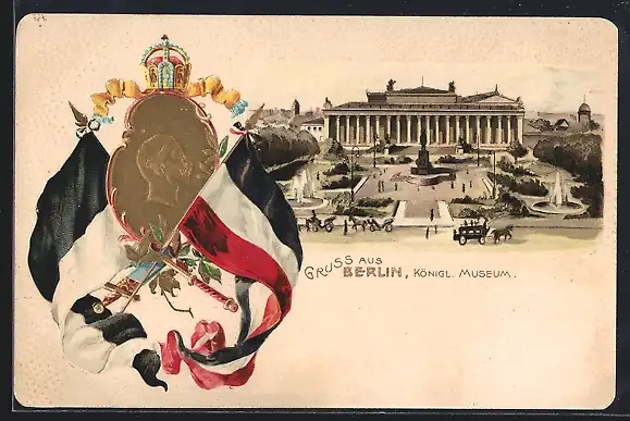 Lithographie Berlin, Blick auf das Königliche Museum im Lustgarten, Portrait des Kaisers mit Standarten