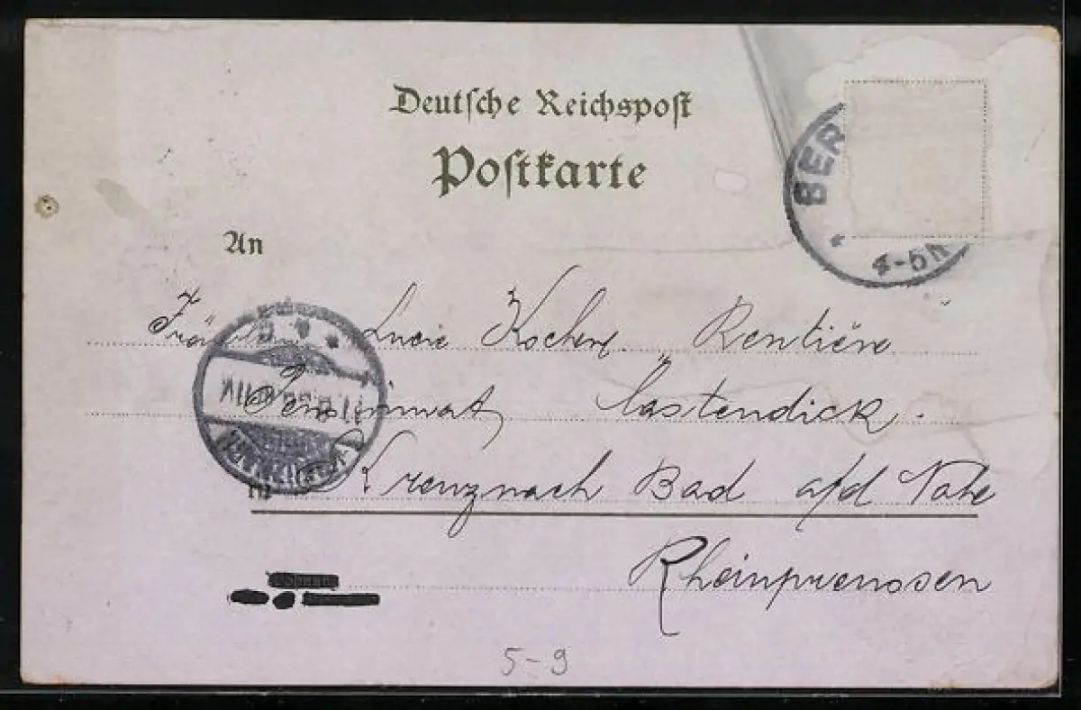 Personenbezogene Daten auf der Rückseite der Karte wurden durch blauen Textmarker unkenntlich gemacht. Die blauen Stellen sind auf die Vorderseite durchgeweicht und wirken sich negativ auf das Postkartenfoto aus