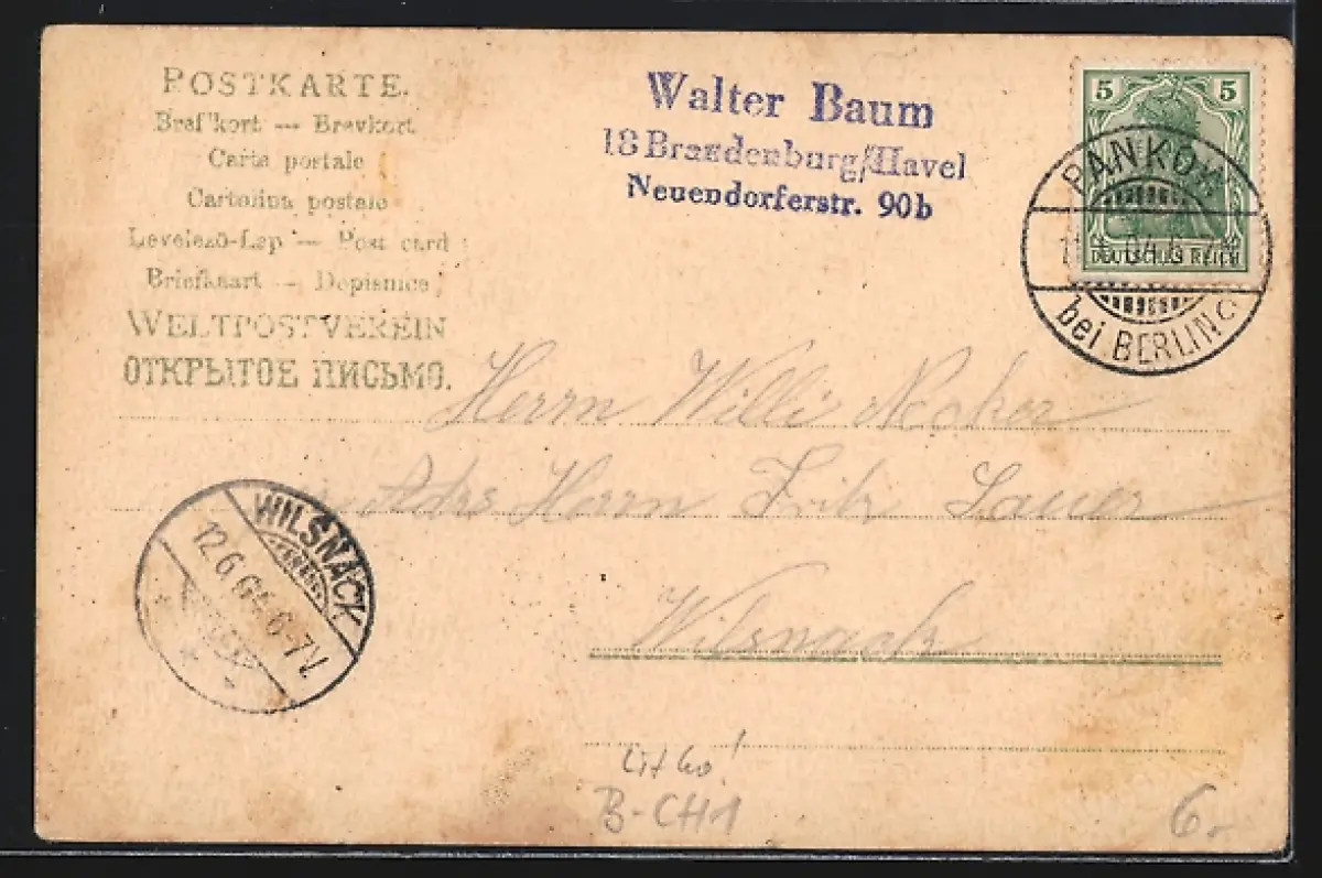 Personenbezogene Daten auf der Rückseite der Karte wurden durch blauen Textmarker unkenntlich gemacht. Die blauen Stellen sind auf die Vorderseite durchgeweicht und wirken sich negativ auf das Postkartenfoto aus