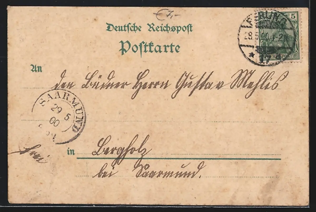 Personenbezogene Daten auf der Rückseite der Karte wurden durch blauen Textmarker unkenntlich gemacht. Die blauen Stellen sind auf die Vorderseite durchgeweicht und wirken sich negativ auf das Postkartenfoto aus
