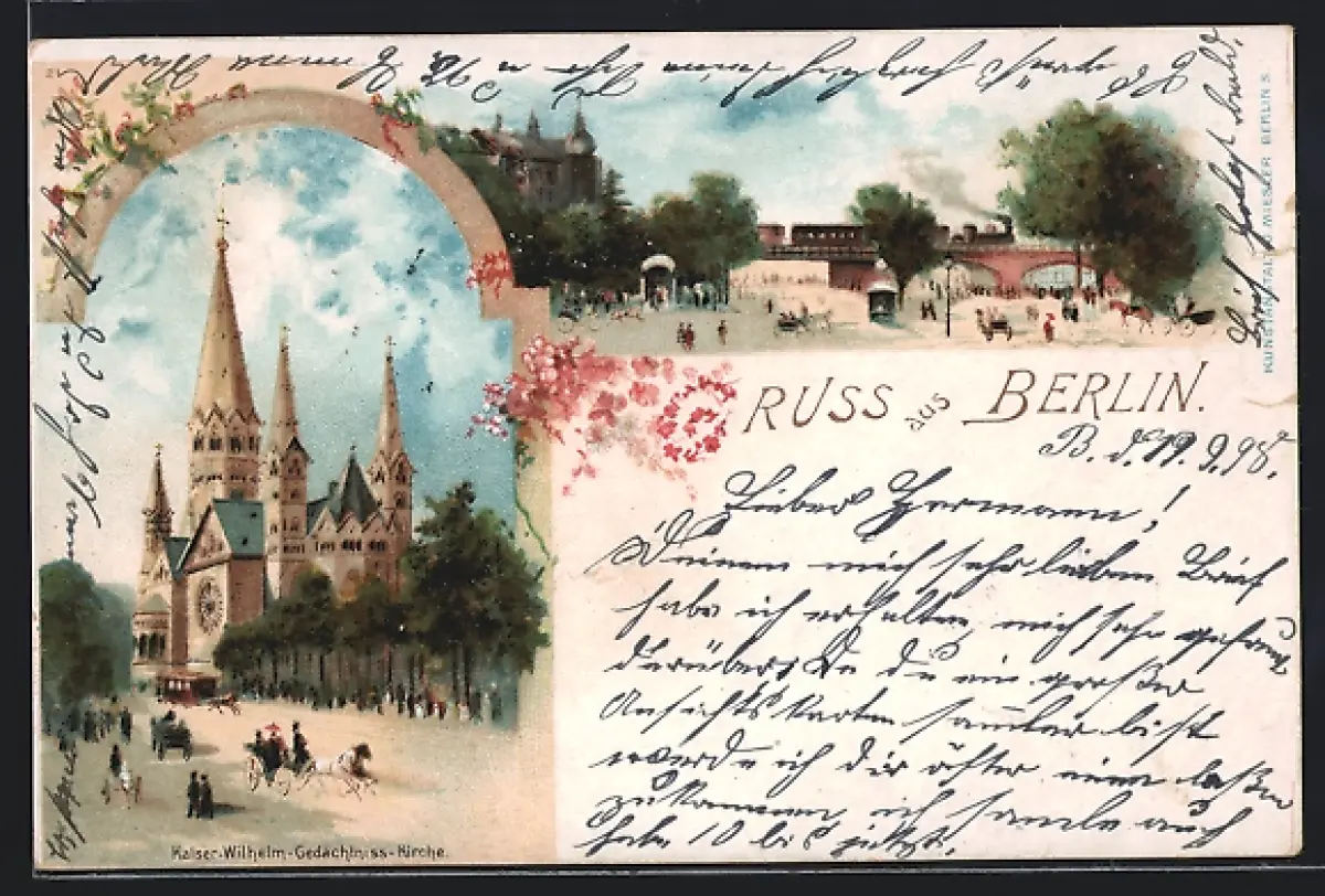 Lithographie Berlin-Charlottenburg, Kaiser-Wilhelm-Gedächtniskirche, Bahnhof