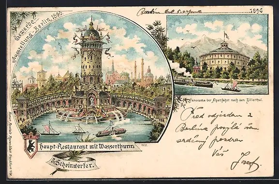 Lithographie Berlin, Gewerbe-Ausstellung 1896, Haupt-Restaurant mit Wasserturm & Scheinwerfer, Dampfer