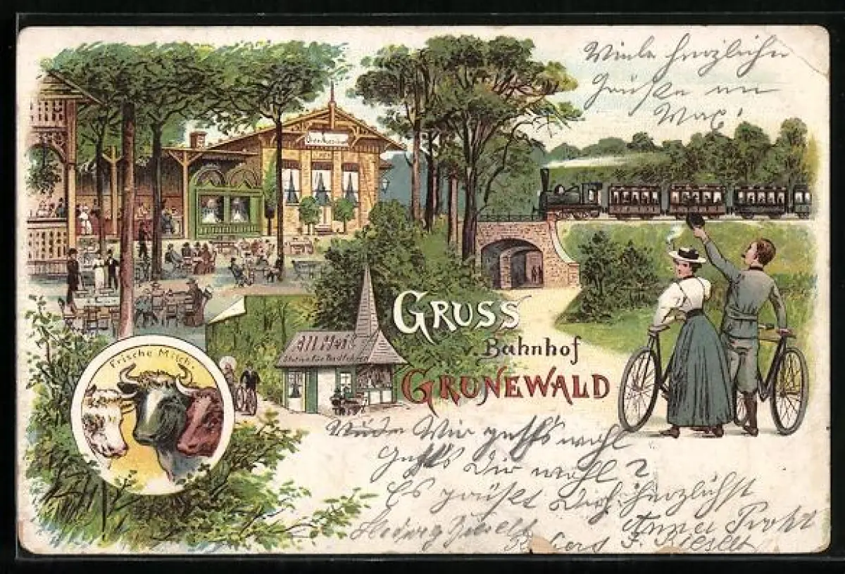 Lithographie Berlin-Grunewald, Bahnhof, Bier-Ausschank, Eisenbahn, Fahrrad, Station für Radfahrer, Kühe
