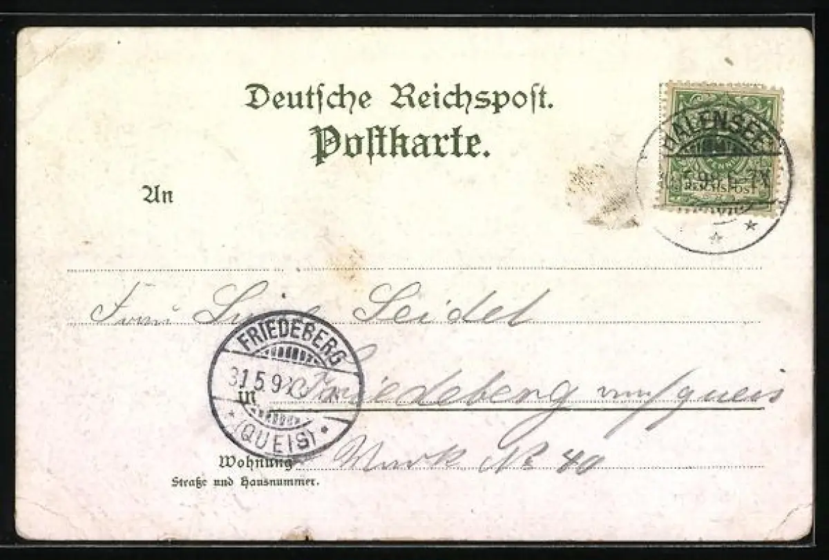 gelaufen 1898, Eckknicke re., Eckknick li. unten, Einriss und Oberflächenschäden vorn unten