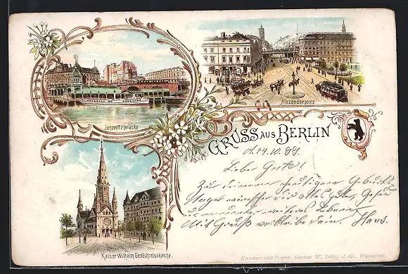 Lithographie Berlin, Janowitzbrücke, Kaiser Wilhelm Gedächtniskirche, Alexanderplatz