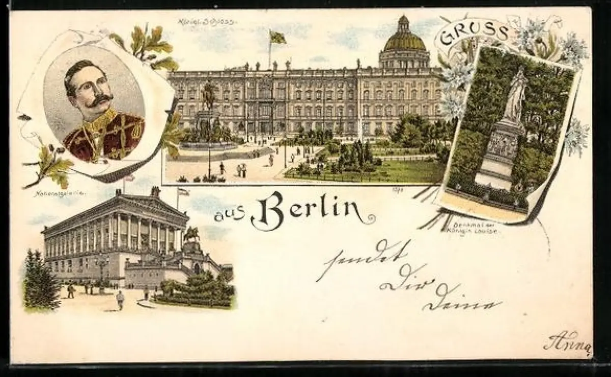 Lithographie Berlin, Königliches Schloss, Denkmal der Königin Louise, Nationalgalerie