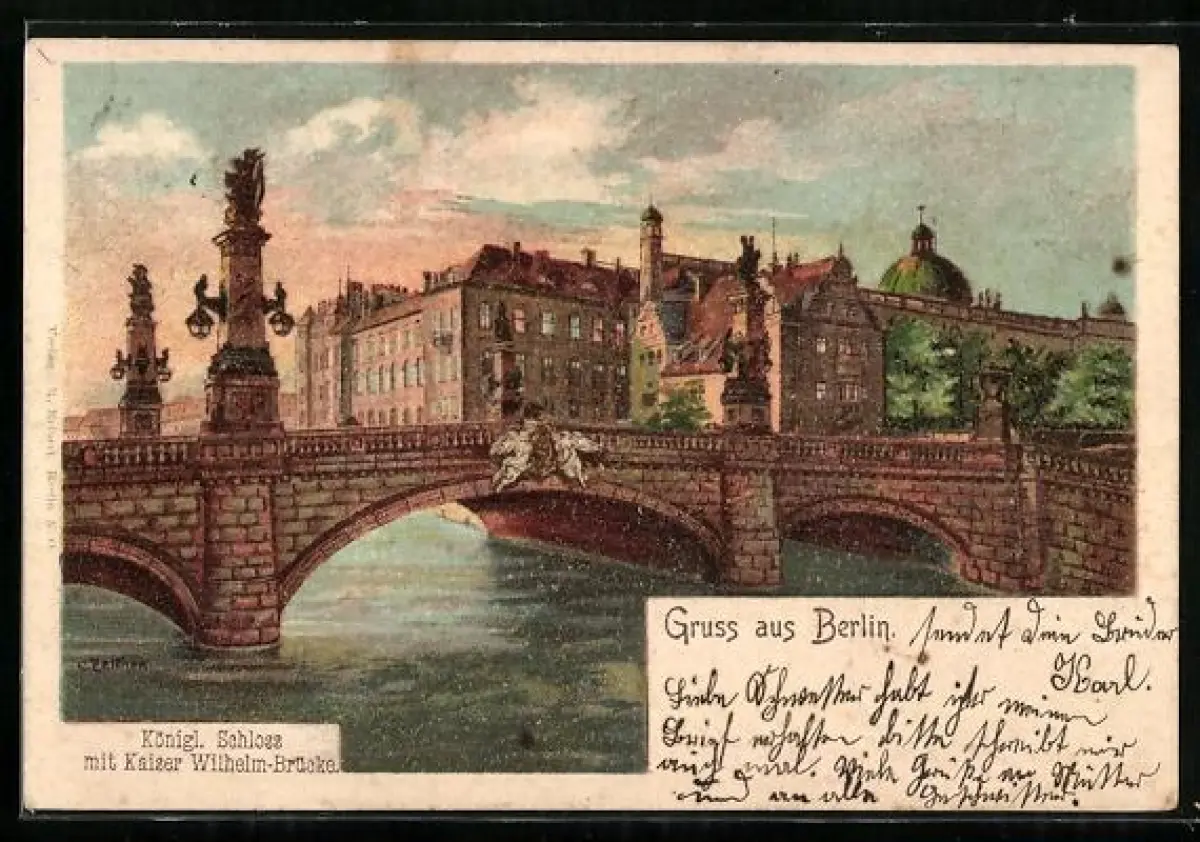 Lithographie Berlin, Königliches Schloss, Kaiser Wilhelm-Brücke