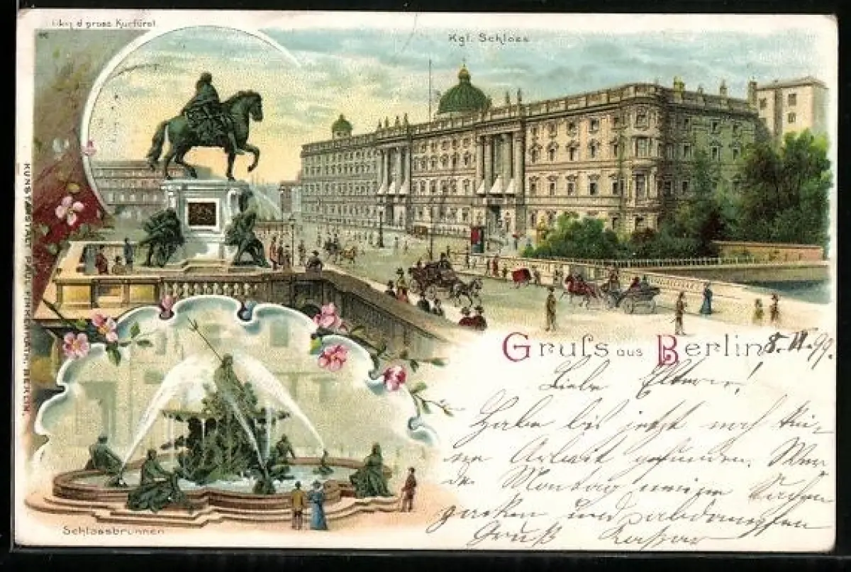 Lithographie Berlin, Königliches Schloss, Schlossbrunnen, Denkmal d. gross. Kurfürsten und Brücke