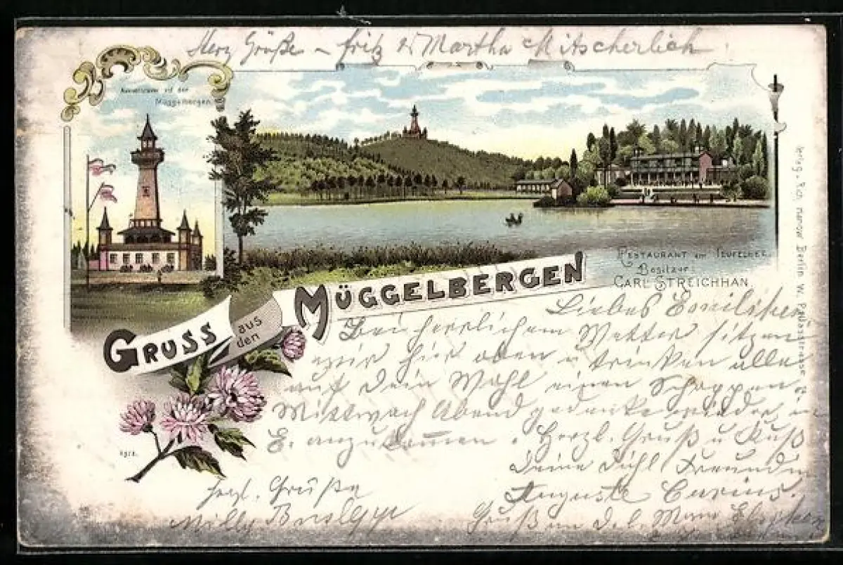 Lithographie Berlin-Köpenick, Restaurant am Teufelsee, Bes. Carl Streichhan, Aussichtsturm Müggelberge