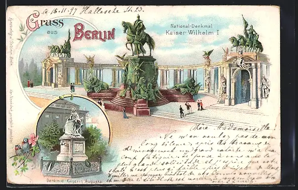 Lithographie Berlin, National-Denkmal Kaiser Wilhem I, Denkmal d. Kaiserin Augusta