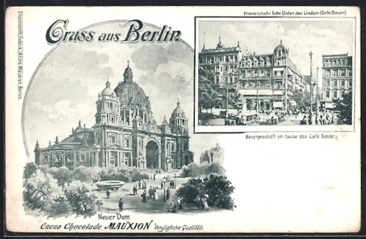 Lithographie Berlin, Neuer Dom, Café Bauer in der Friedrichstr. Ecke Unter den Linden