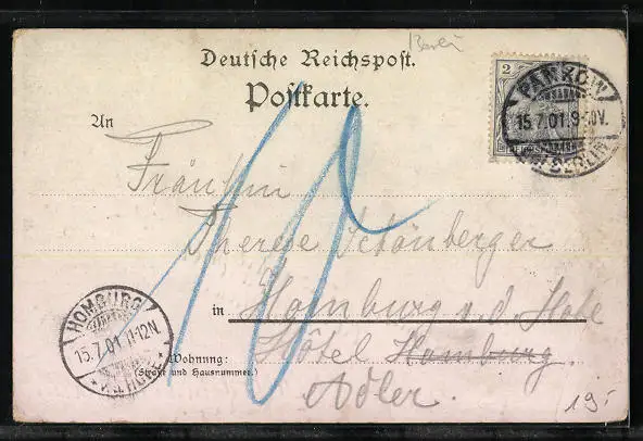 gelaufen 1901, Eckknick li. oben, Stempelspur, Bugspur li. unten, guter Zustand