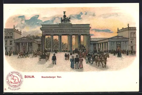 Lithographie Berlin, Partie am Brandenburger Tor, Reklame für Hoffmann`s Stärkefabriken Salzuflen