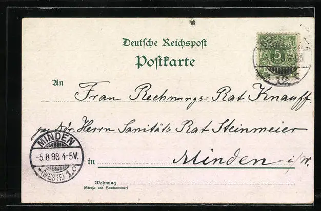 Personenbezogene Daten auf der Rückseite der Karte wurden durch blauen Textmarker unkenntlich gemacht. Die blauen Stellen sind auf die Vorderseite durchgeweicht und wirken sich negativ auf das Postkartenfoto aus