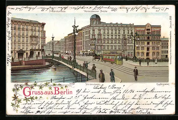 Lithographie Berlin, Pferdebahn auf der Weidendamm-Brücke, mit Friedrichstrasse und Kupfergraben