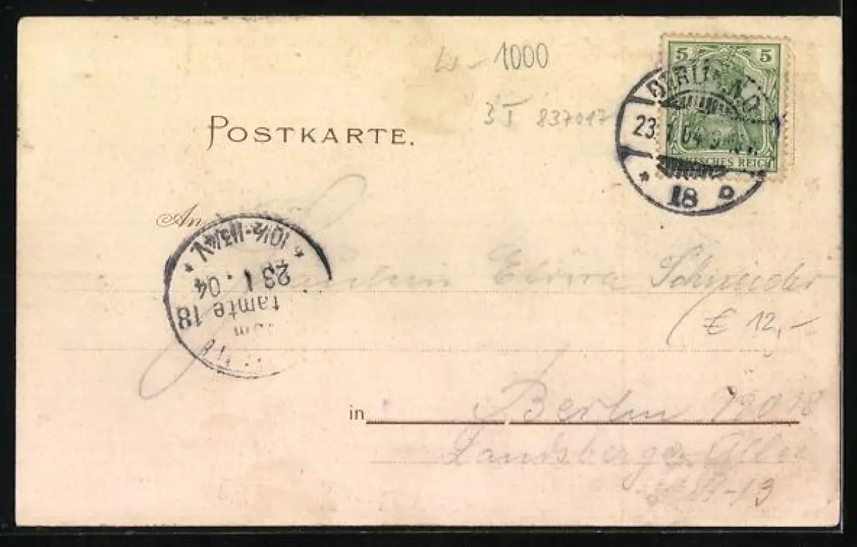 gelaufen 1904, vorderseitig Klebe- und Papierreste, guter Zustand