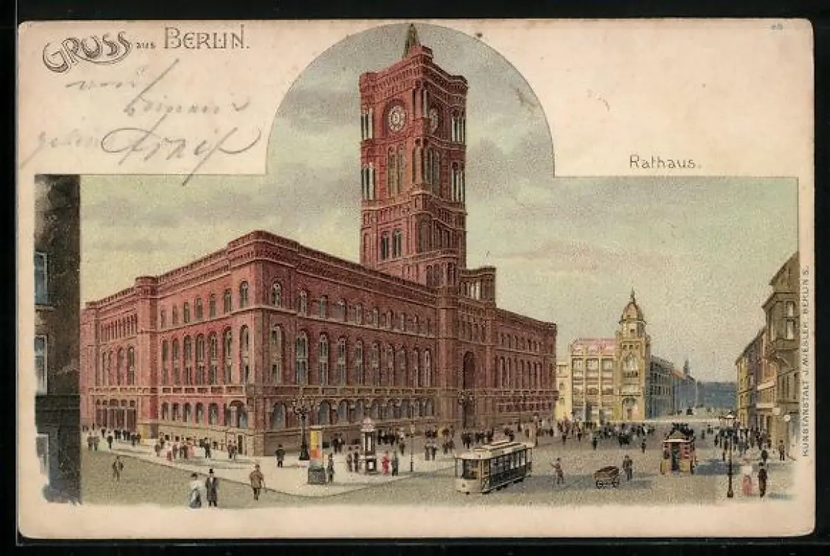 Lithographie Berlin, Rotes Rathaus, Spandauer Strasse, Strassenbahn