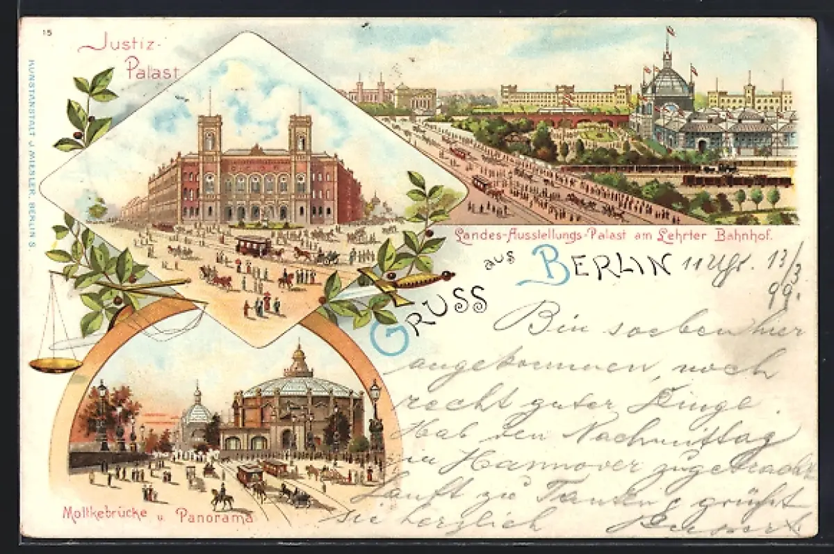 Lithographie Berlin-Tiergarten, Justizpalast, Landes-Ausstellungs-Palast am Lehrter Bahnhof, Moltkebrücke und Panorama