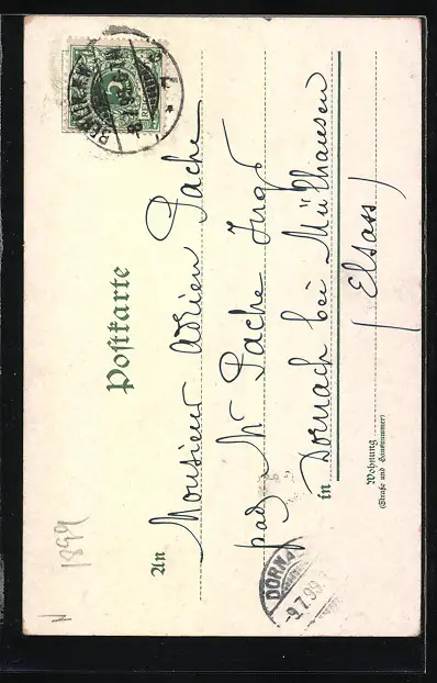 Personenbezogene Daten auf der Rückseite der Karte wurden durch blauen Textmarker unkenntlich gemacht. Die blauen Stellen sind auf die Vorderseite durchgeweicht und wirken sich negativ auf das Postkartenfoto aus