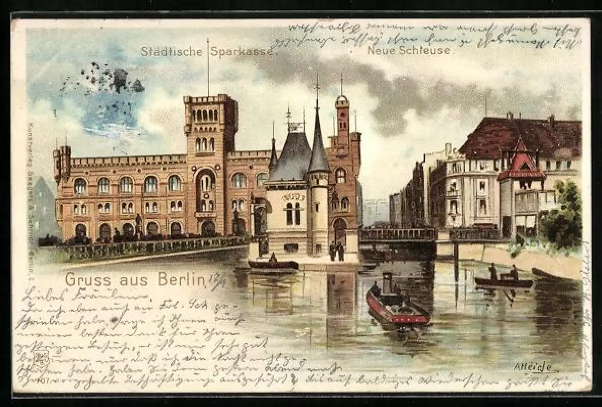 Lithographie Berlin-Tiergarten, Städtische Sparkasse, Neue Schleuse