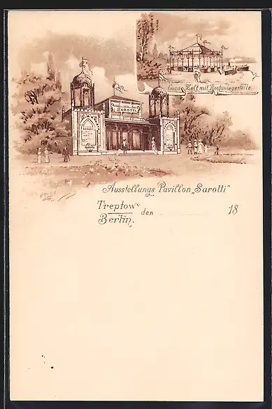 Lithographie Berlin-Treptow, Ausstellungs-Pavillon Sarotti, Cacao-Zelt mit Bootanlegestelle