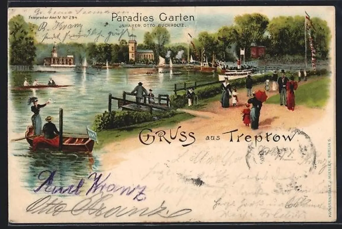 Lithographie Berlin-Treptow, Dampfer und Ruderboote auf der Spree, Spaziergänger