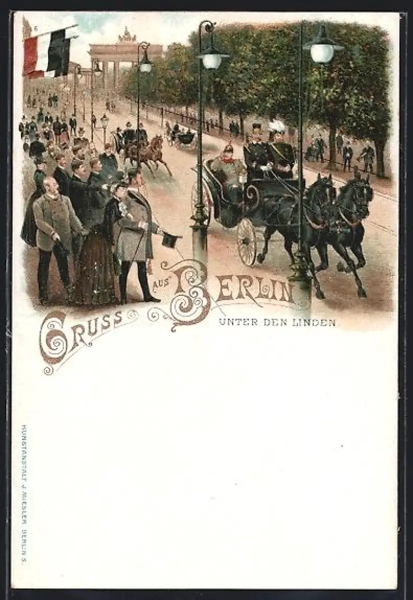 Lithographie Berlin, Unter den Linden, Brandenburger Tor, Kaiserliche Ausfahrt in der Kutsche, Menschenmenge, Fahnen