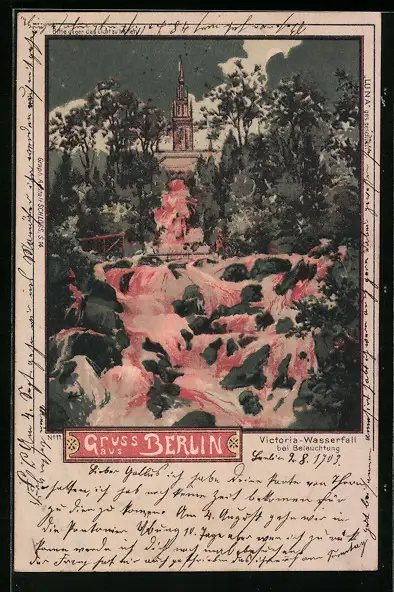 Lithographie Berlin, Victoria-Wasserfall bei Beleuchtung, Halt gegen das Licht